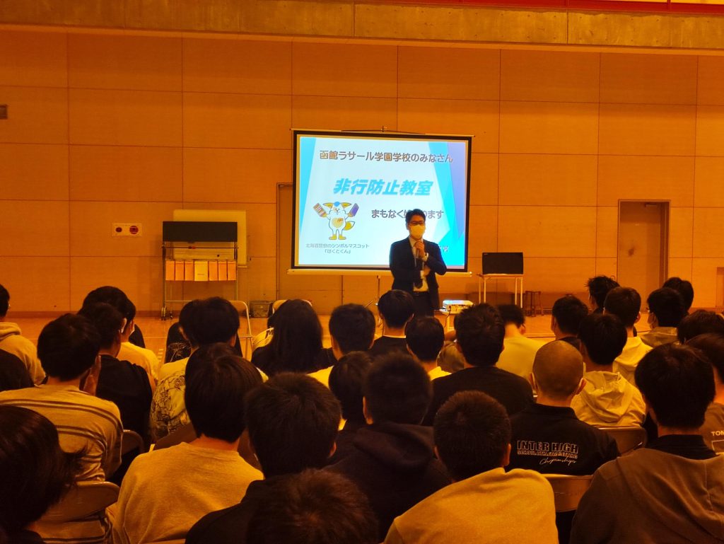 5月25日(木)5校時に函館中央警察署生活安全課の方より、SNSの利用に際してのトラブル防止を目的として非行防止教室と題して講演をしていただきました。