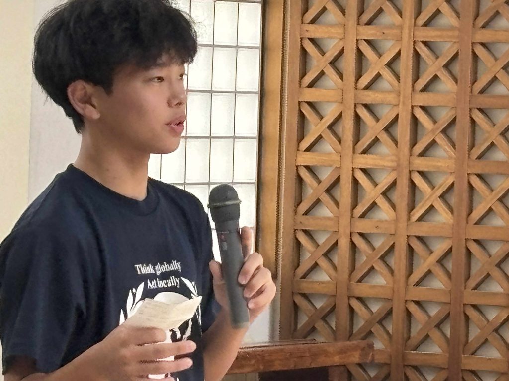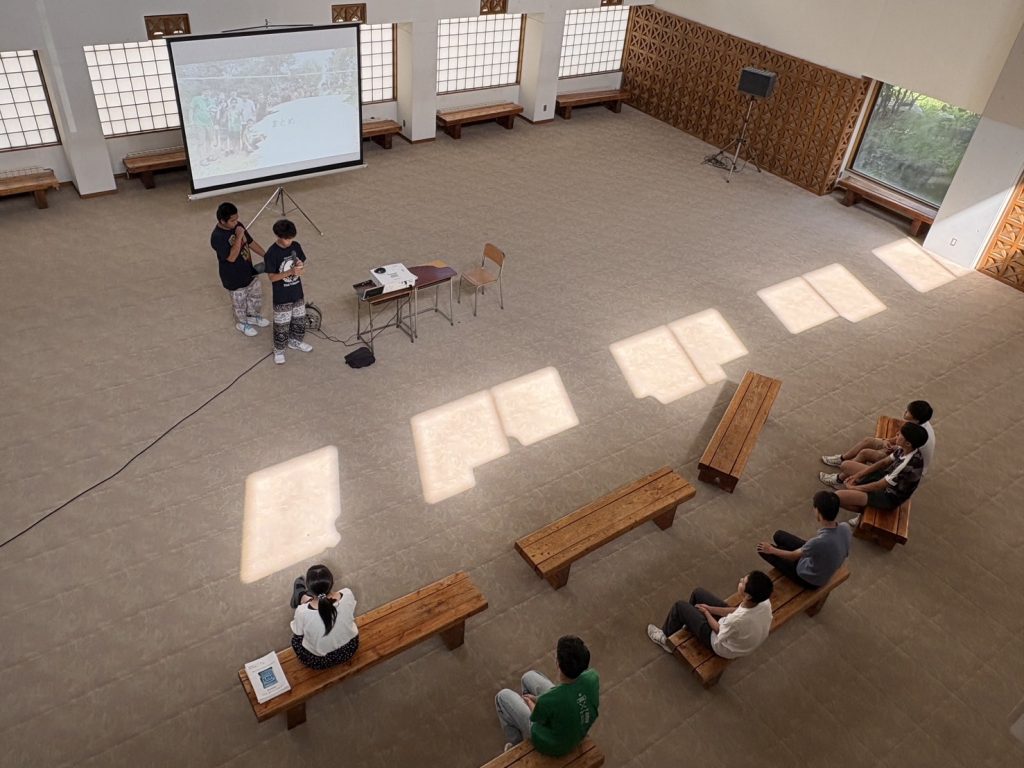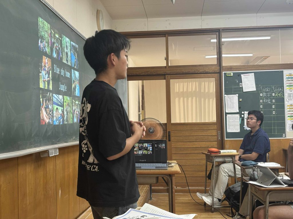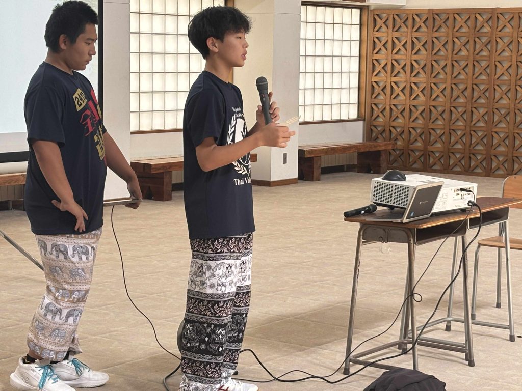 夏季休暇中にタイ・サンクラブリでのボランティア活動に参加した生徒たちが、校内で帰国報告会を行っています。 報告会では、現地での活動の様子や子どもたちとの交流をスライドや映像を用いて発表し、それぞれの学びや気づきを共有しています。参加した生徒からは「相手の立場に立って考えることの大切さ」「現地の子どもたちの笑顔から多くを学んだ」といった声が聞かれ、会場の生徒・教員も熱心に耳を傾けていました。 今回参加した12名の生徒による報告は、10月1日まで順次行われる予定です。